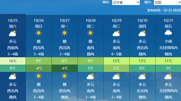 中国天气网讯 今天(10月25日),辽宁大部将现明显升温,但明后两天在冷空气影响下,大部地区会显著降温,沈阳最高气温将降至不足10℃,冷意凸显,需注意防寒保暖。